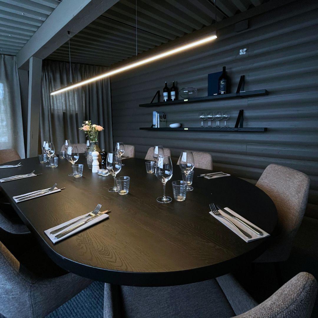 Til restaurantens chambre separée ble det laget et stort, ovalt spisebord i massiv eik og grafitt-svart farge, som skaper en eksklusiv og tilbaketrukket sittegruppe for større selskaper.
