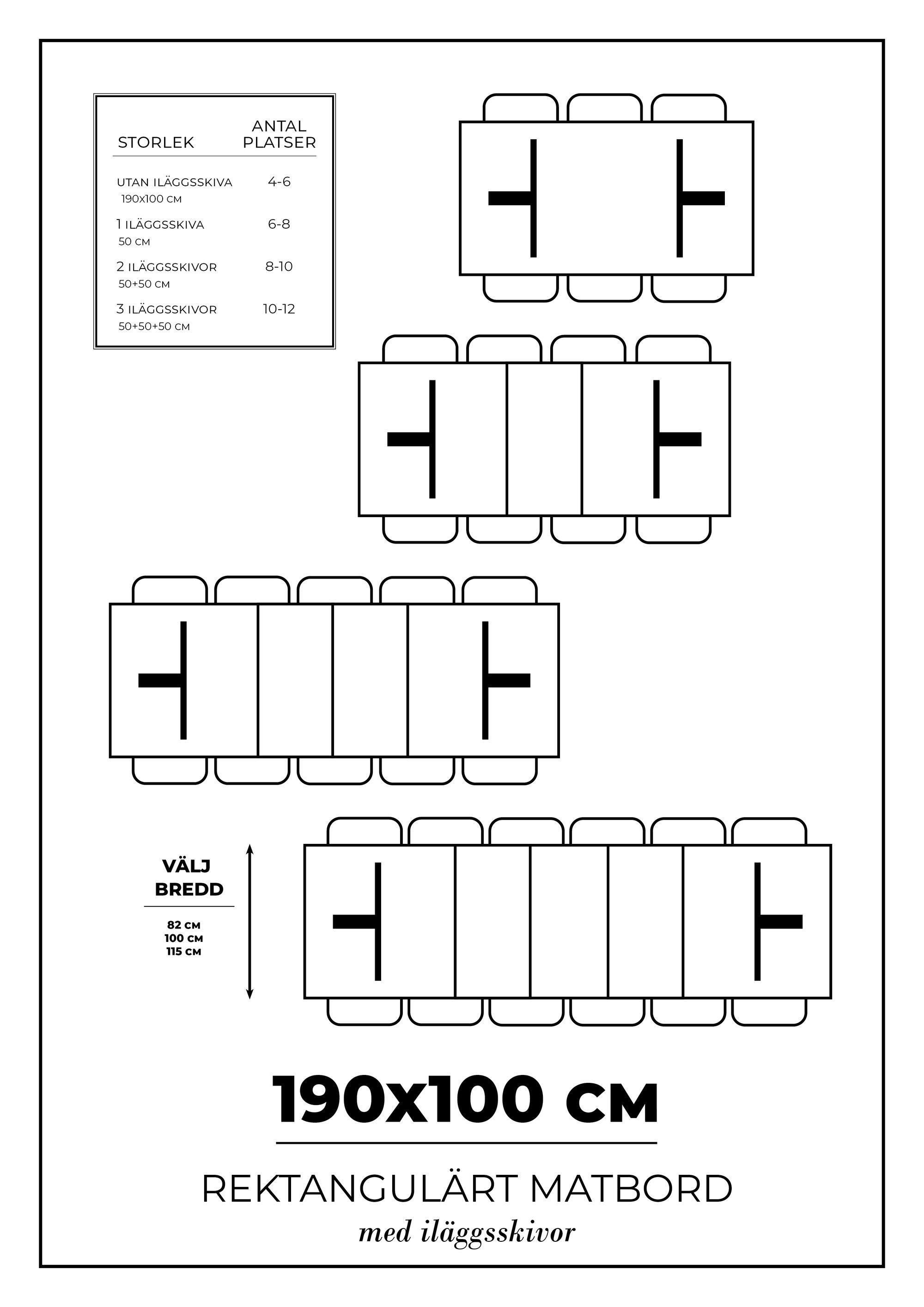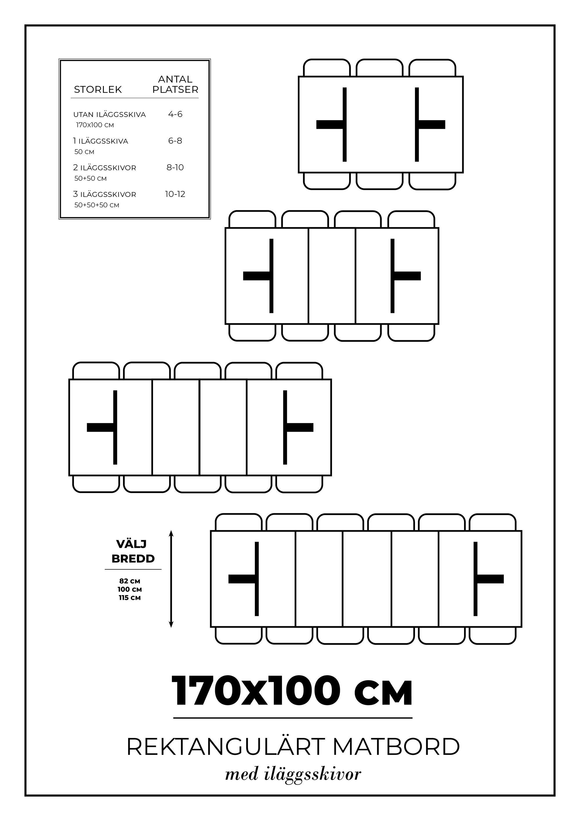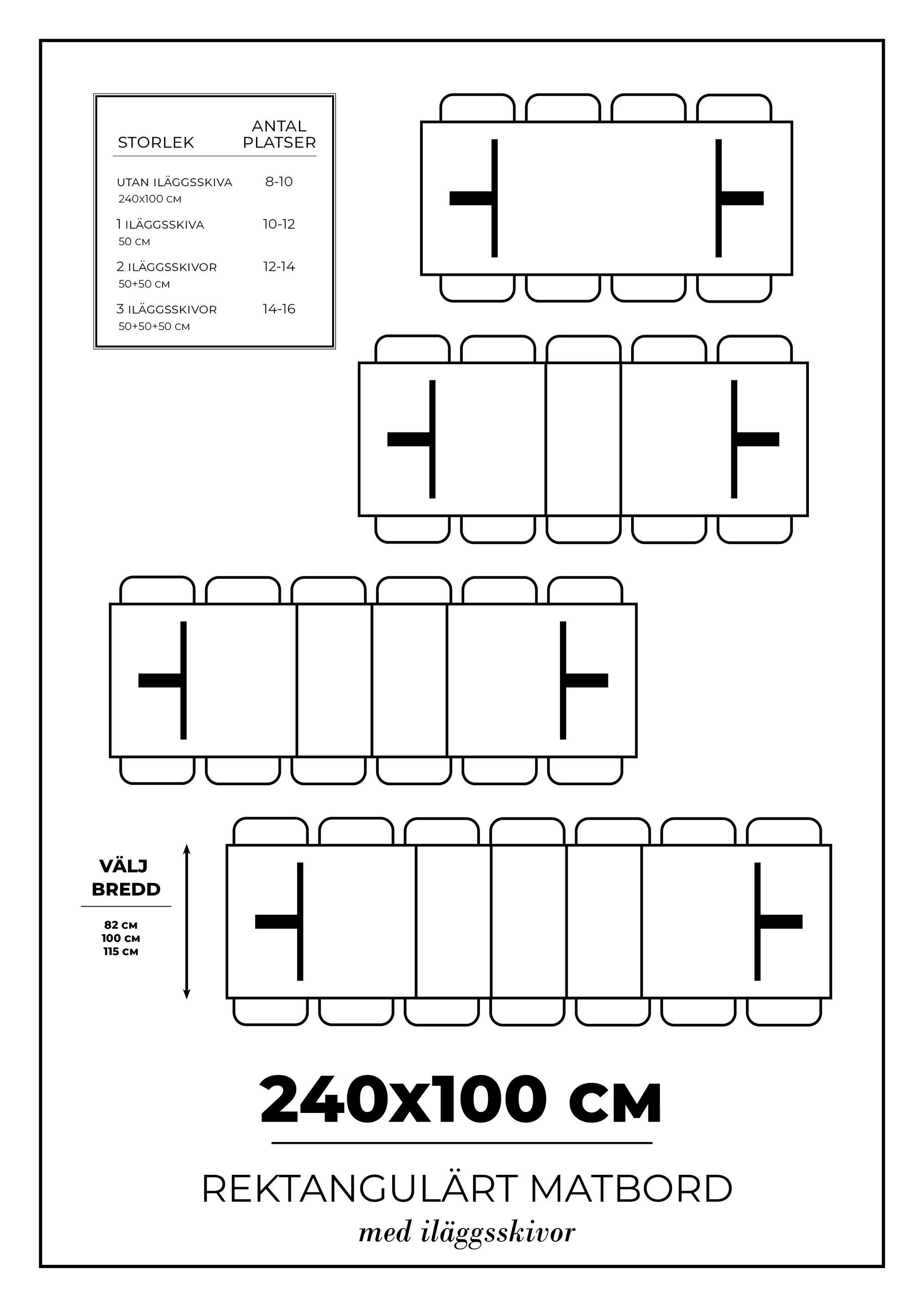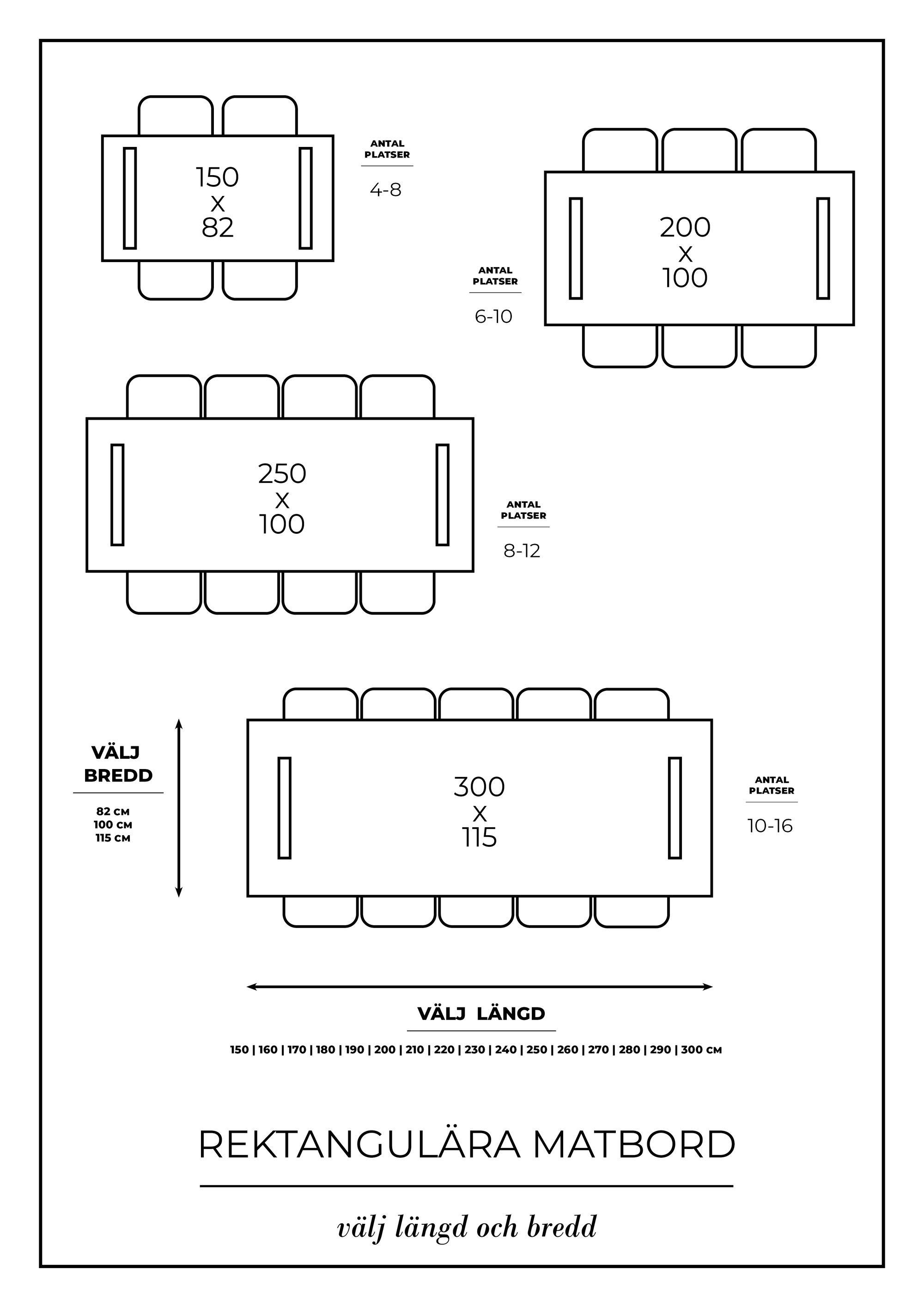 Anta at hver person trenger ca. 60 cm i bredden ved bordet. Det betyr at 6 personer vil sitte komfortabelt rundt et spisebord som er 180 cm, og 8 personer vil sitte komfortabelt rundt et spisebord som er 240 cm. Våre rektangulære spisebord kan designes med ett eller flere uttrekksplader. Perfekt for deg som ønsker et mindre spisebord til hverdagsbruk, men men et stort og koselig spisebord når det kommer gjester.