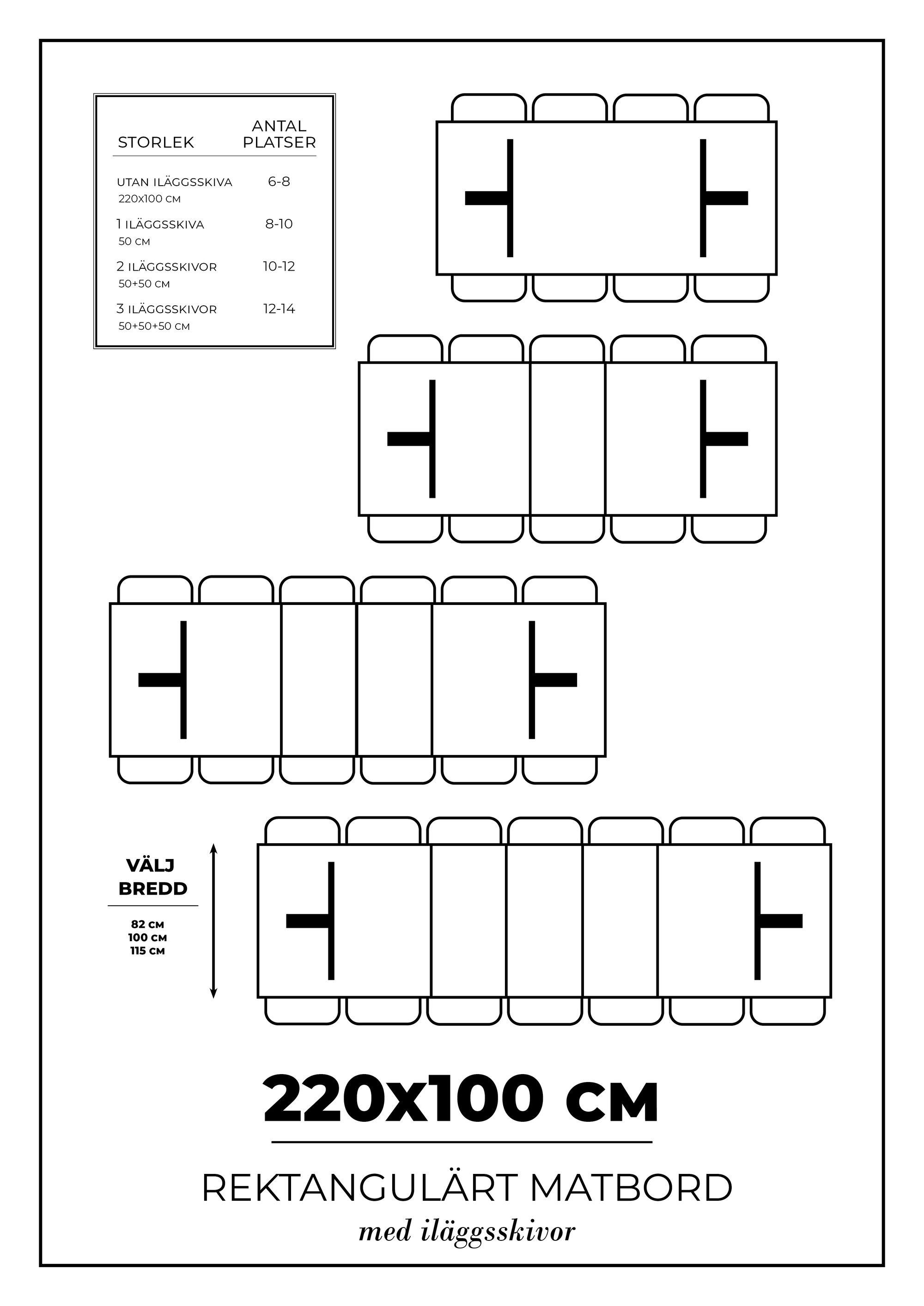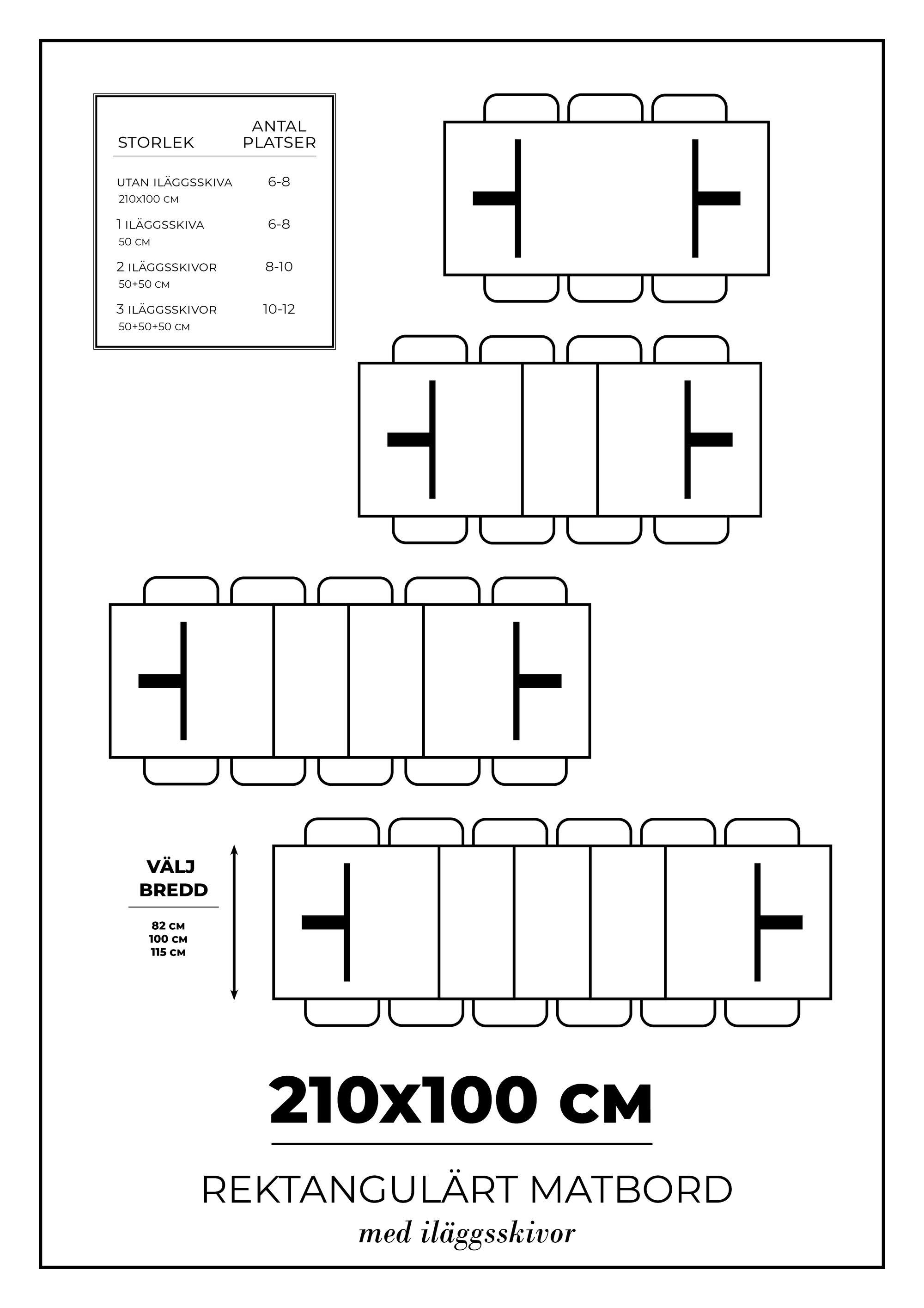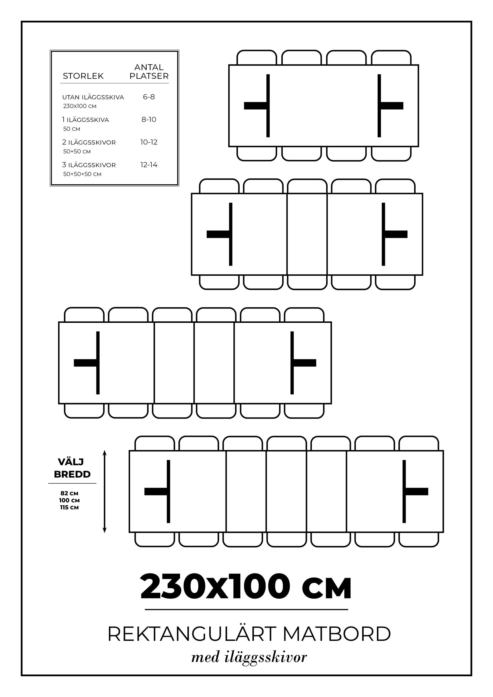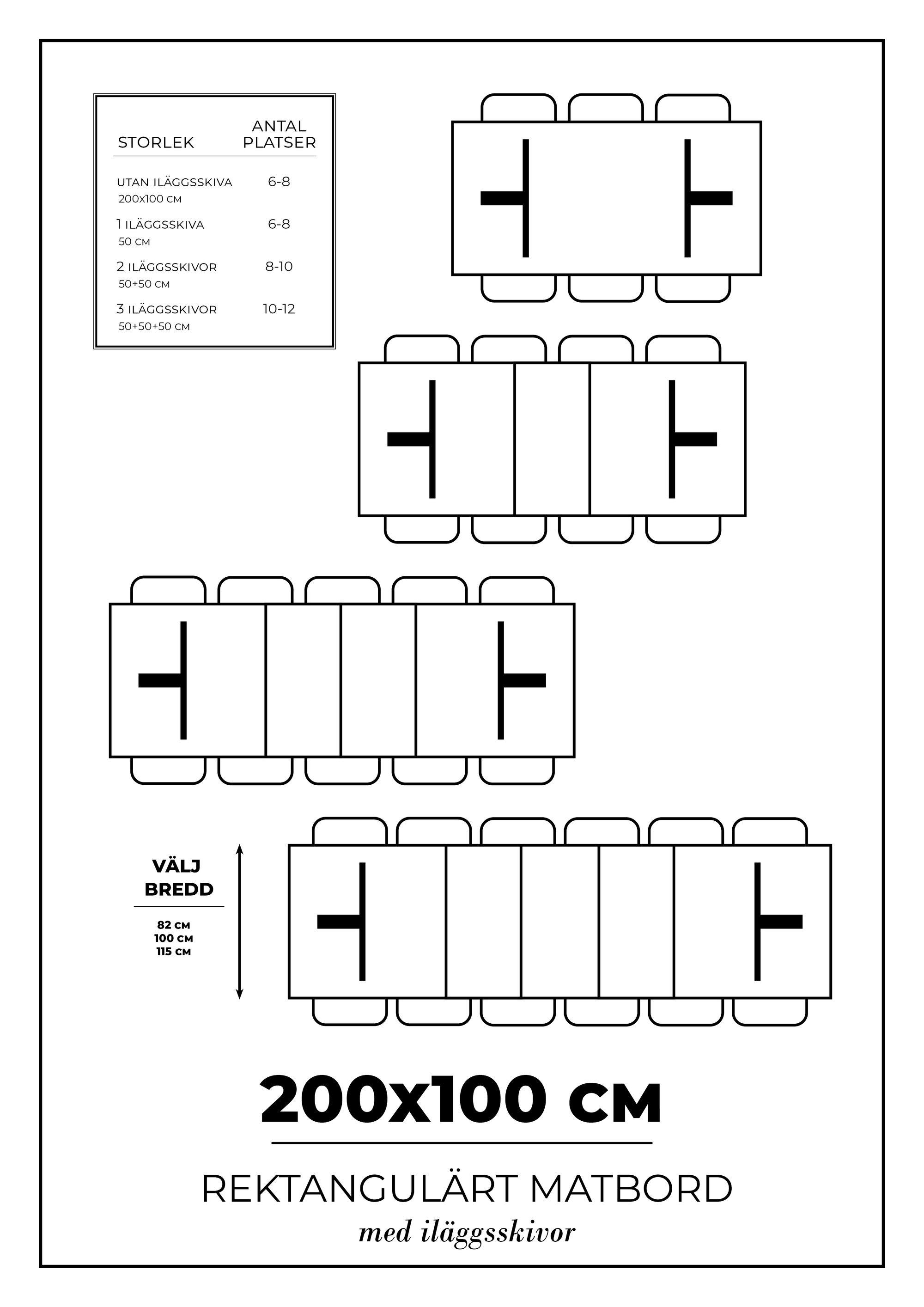 Anta at hver person trenger ca. 60 cm i bredden ved bordet. Det betyr at 6 personer vil sitte komfortabelt rundt et spisebord som er 180 cm, og 8 personer vil sitte komfortabelt rundt et spisebord som er 240 cm. Våre rektangulære spisebord kan designes med ett eller flere uttrekksplader. Perfekt for deg som ønsker et mindre spisebord til hverdagsbruk, men men et stort og koselig spisebord når det kommer gjester.