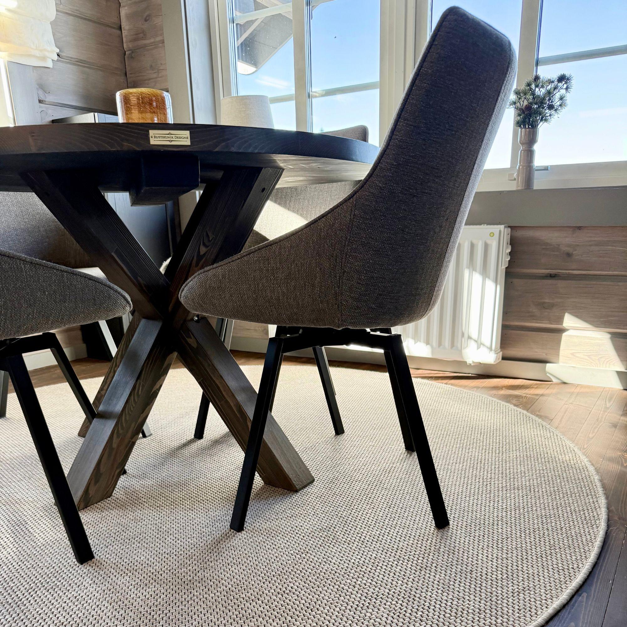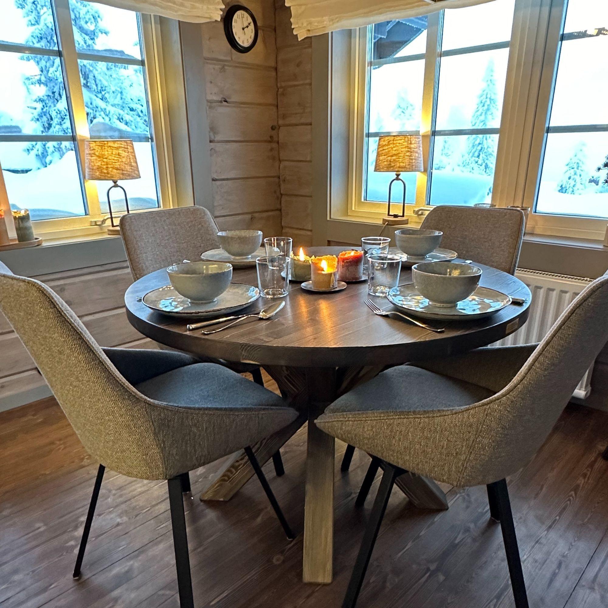I tilknytning til kjøkkenet står et rundt spisebord med kryssben, kombinert med fire svingbare, polstrede stoler. Runde bord er en av de mest takknemlige løsningene når man jobber med hytteinnredning på fjellet, fordi de gjør det enklere å bevege seg rundt på liten plass og skaper en mykere romopplevelse. De gir nærhet, noe som er perfekt for lange frokoster og kvelder foran peisen.