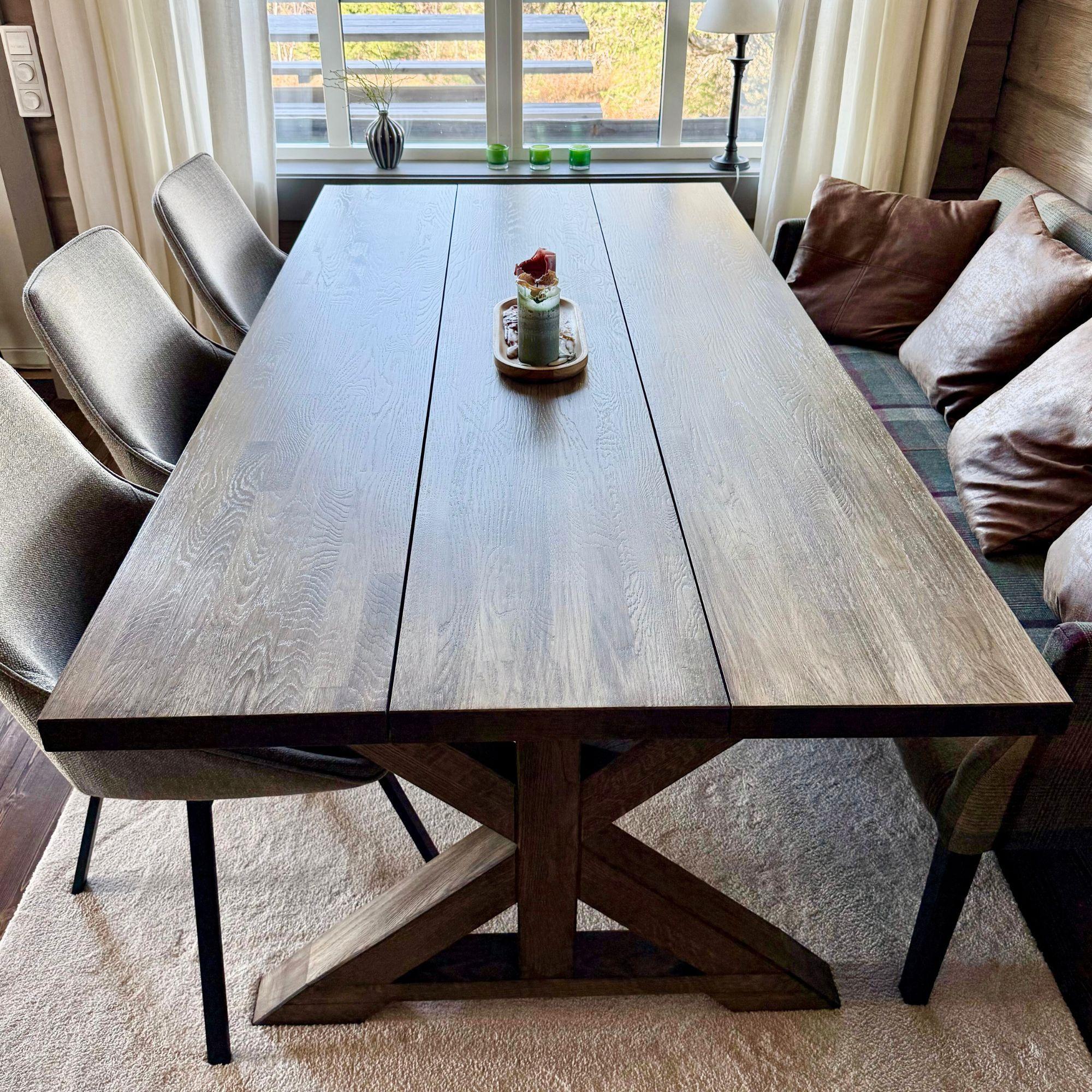 I hovedstuen står hyttens stolthet: et rektangulært spisebord, spesiallaget med den karakteristiske «snøfnuggbein»-formen. Bordet er robust, solid og designet for å tåle mange år med middager, venner, familie og skikompiser. De detaljerte bena er inspirert av fjellets former og gir møbelet en unik identitet.
