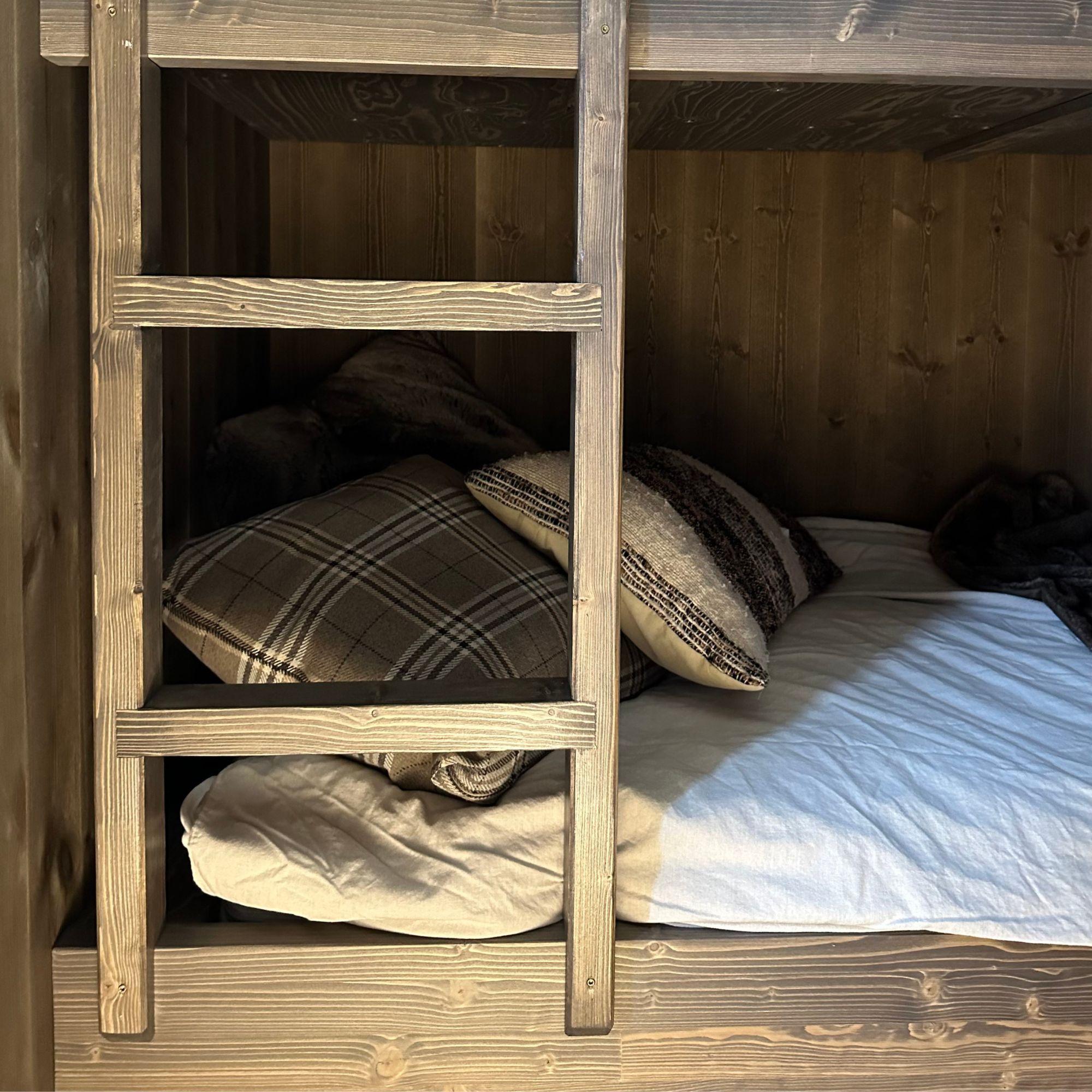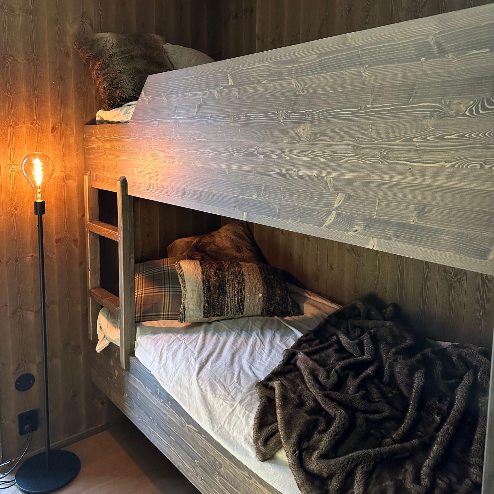 Et av de smarteste innslagene i hytta er de plassbygde køyesengene, som er laget for å optimalisere hver centimeter av rommet. Med integrert stige, solid konstruksjon og oppbevaringsmuligheter er de både estetiske og svært funksjonelle. Dette er et perfekt eksempel på hvordan man kan få en liten fjellhytte til å føles mye større.