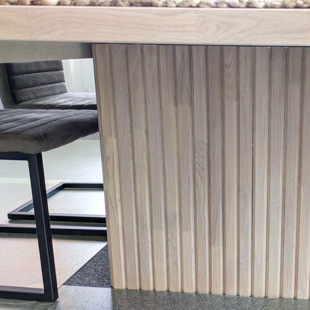 Når det gjaldt valg av materiale, var beslutningen ganske enkel. De visste at de ville ha eik. Eik er en tresort som både er slitesterk og tidløs – perfekt for et spisebord som blir brukt mye. De hadde tidligere hatt et bord i mørkere eik, men denne gangen valgte de en lysere nyanse for å skape variasjon og gi rommet et lysere preg. Under designprosessen fikk de også hjelp til å velge kantprofil, noe som kan påvirke bordets utseende mer enn mange er klar over.
