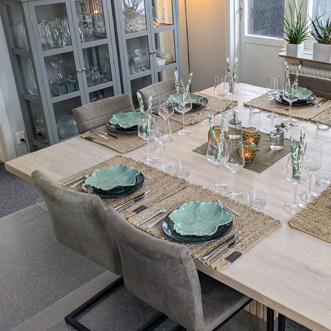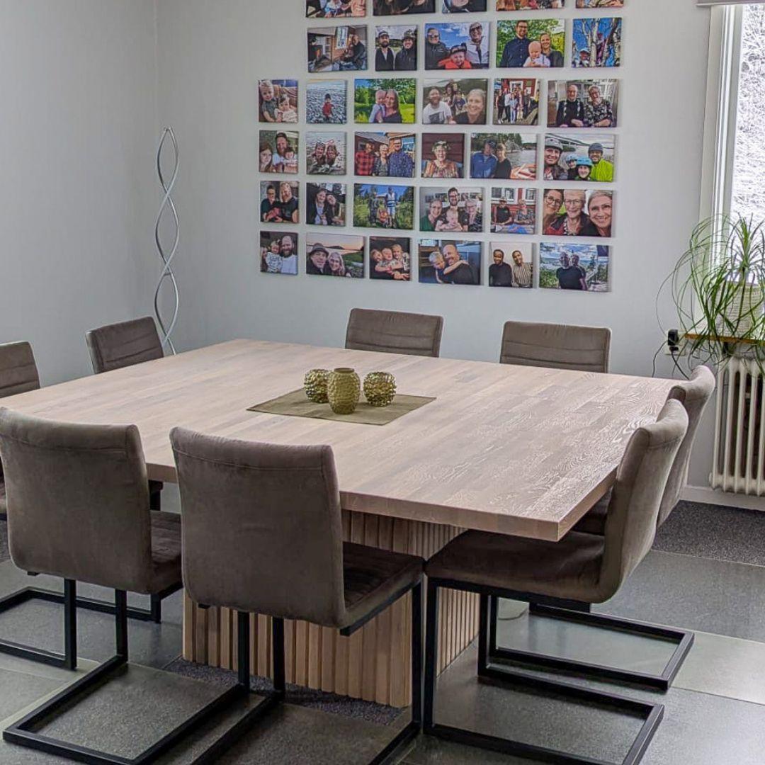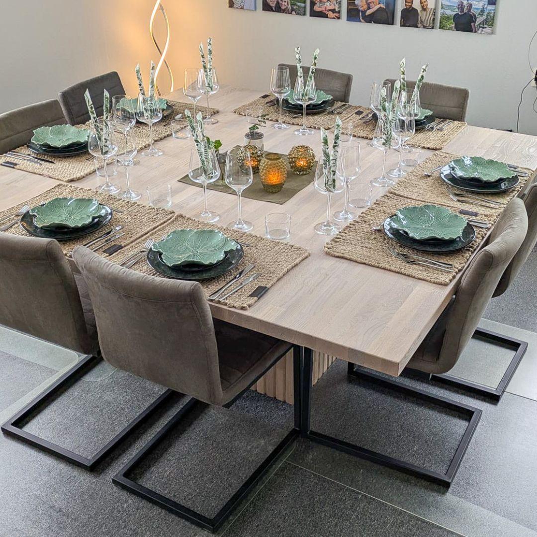 Den firkantede formen gjør det enkelt å se hverandre, noe som skaper en mer sosial og inkluderende atmosfære. En detalj de er spesielt fornøyde med, er designet under bordet. Takket være understellet er det god benplass rundt hele bordet – noe som ellers kan være en utfordring med større bord. Designet gir også bordet et stilig og moderne utseende og er en unik tilpasning spesielt for deres spisebord.