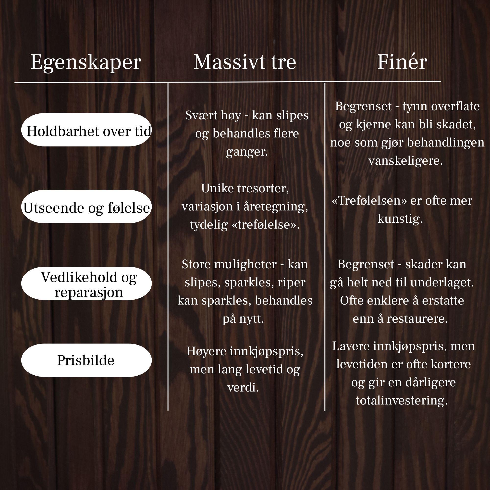 Hvis du er ute etter et spisebord i massivt tre med ekte materialfølelse, lang levetid og muligheten til å slipe det på nytt når du vil - da er massivt tre det klare valget fremfor spisebord i finér. Forskjellen mellom massivt tre og finér handler langt fra bare om pris, men om hvordan møbelet vil stå seg gjennom årene, hvordan det eldes, hvordan det repareres og hvordan det føles i hverdagen.
