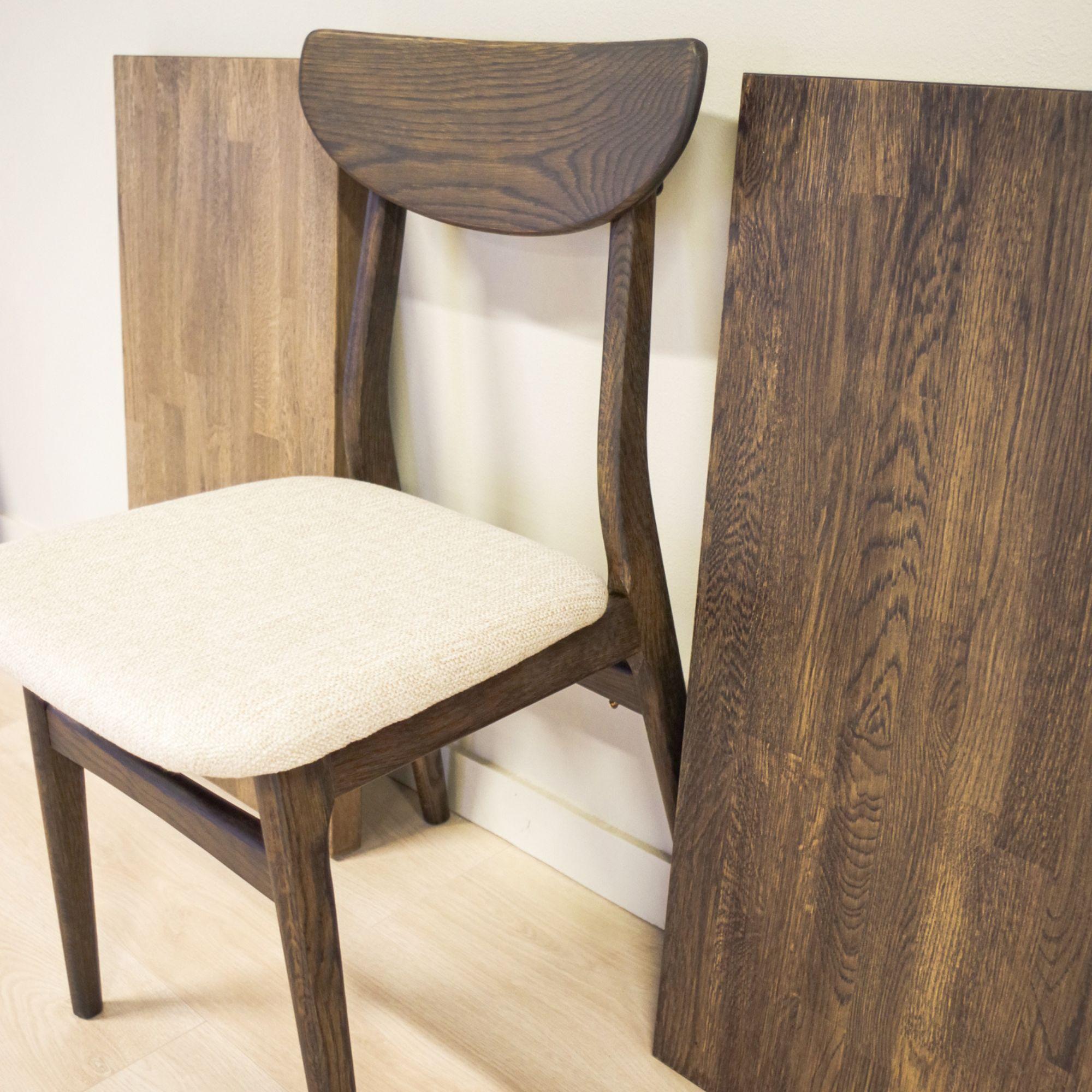 Vi vil også trekke frem at våre farger "Røkt eik" og "Mørk eik" fungerer godt sammen med Rowicos stol i brunfarget eik. Mørk eik er en litt dypere og rødere nyanse enn stolen, men fungerer veldig godt. Røkt eik er en litt lysere nyanse enn stolen, men har den samme gule undertonen, noe som gjør at den også passer veldig godt sammen med Rowicos brune eikestoler.