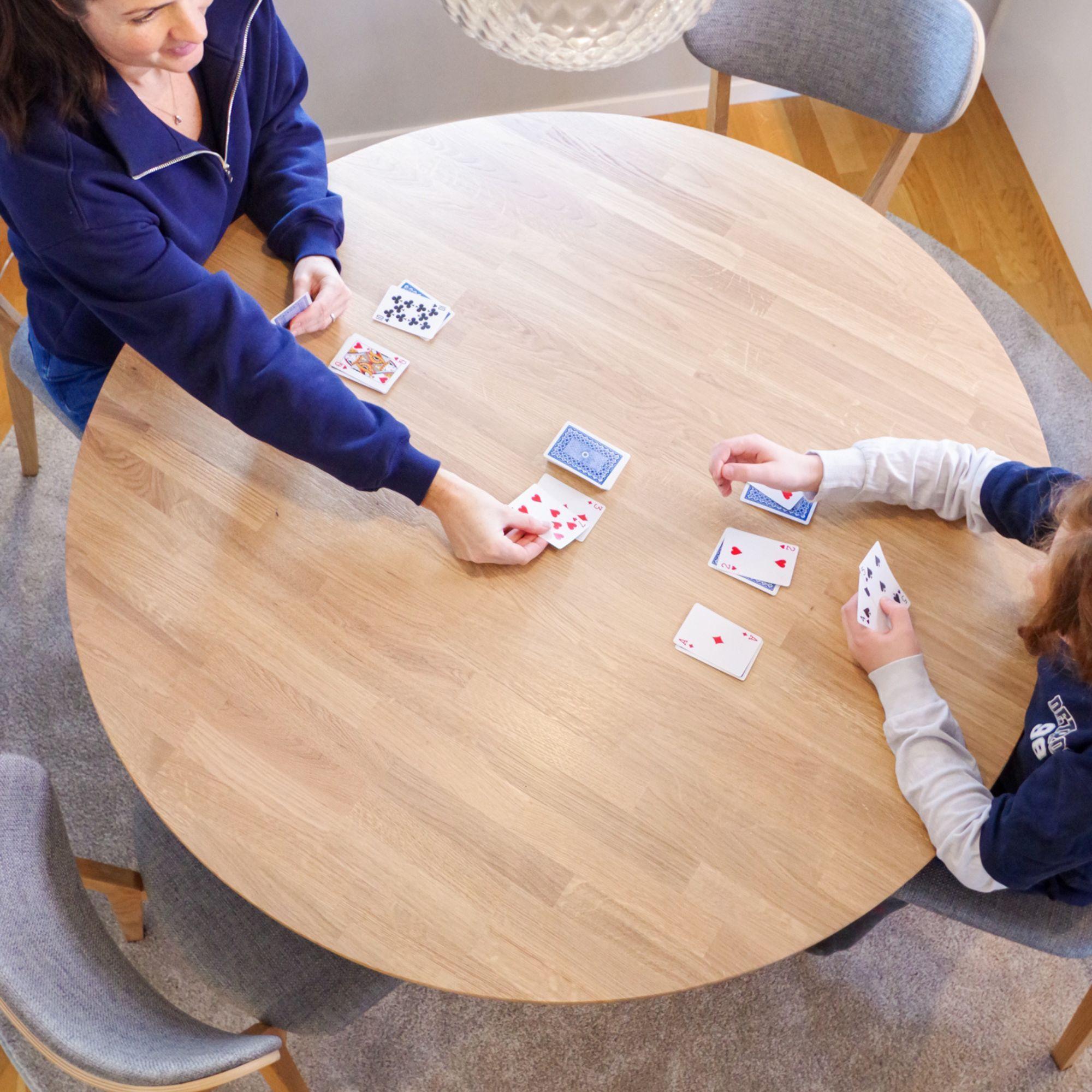 Her kan du skape et rundt spisebord i massiv eik der du får plass til 4, 6, 8, 10, 12 eller hele 16 personer ved hjelp av en ileggsplate!